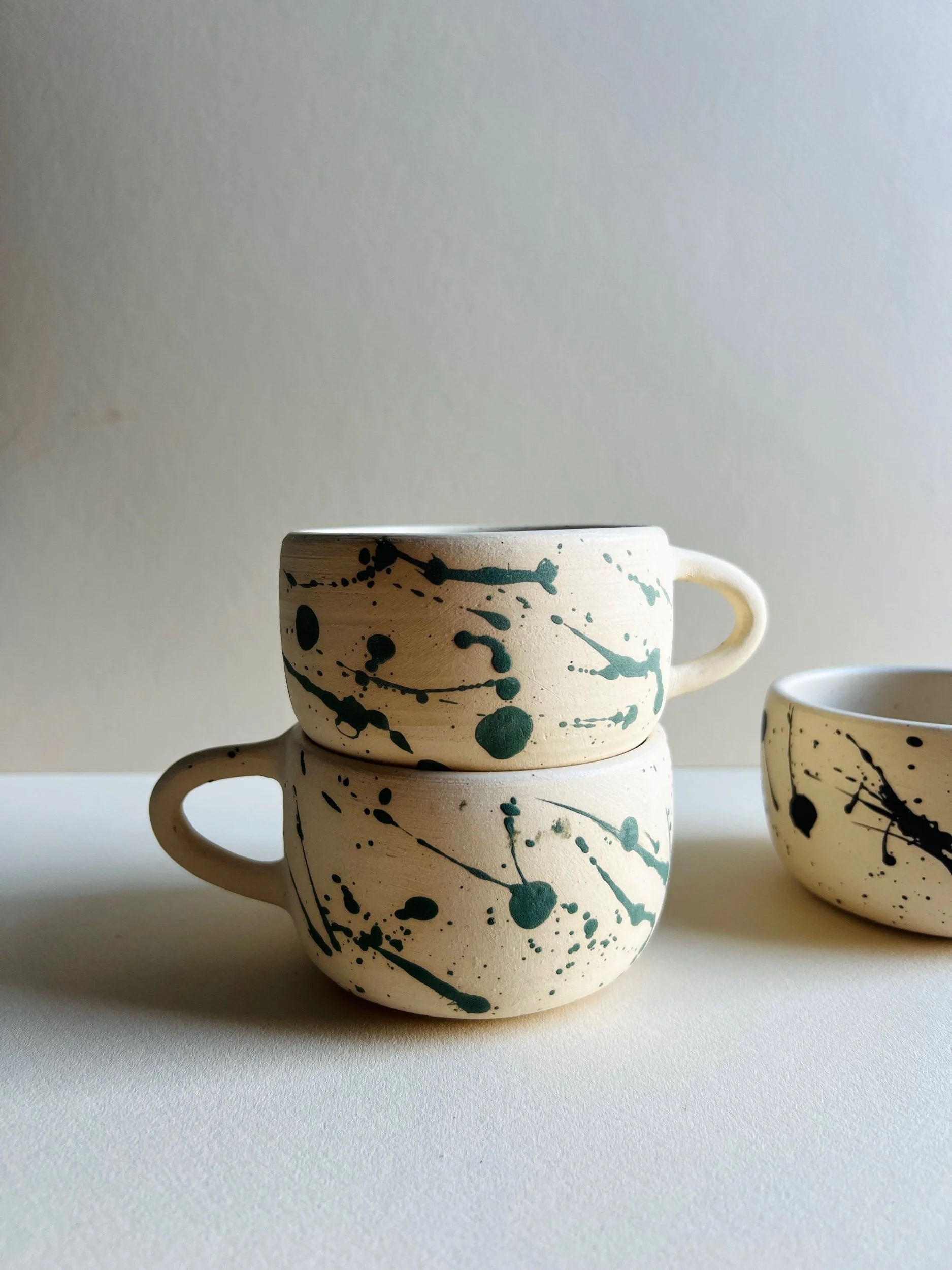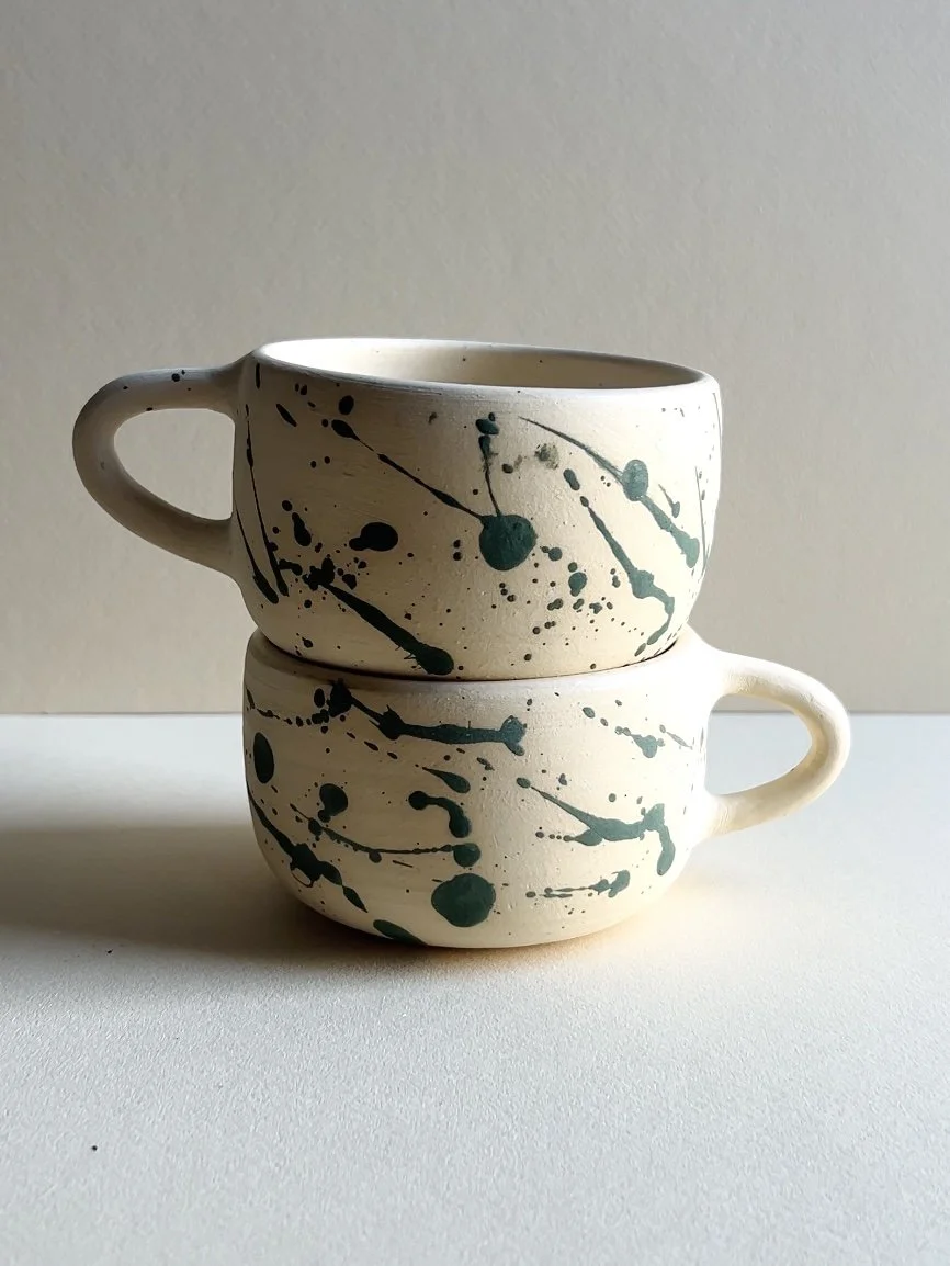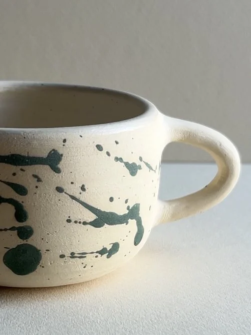 Wheel-thrown mug in a lightly speckled clay, with mossy green splatters.