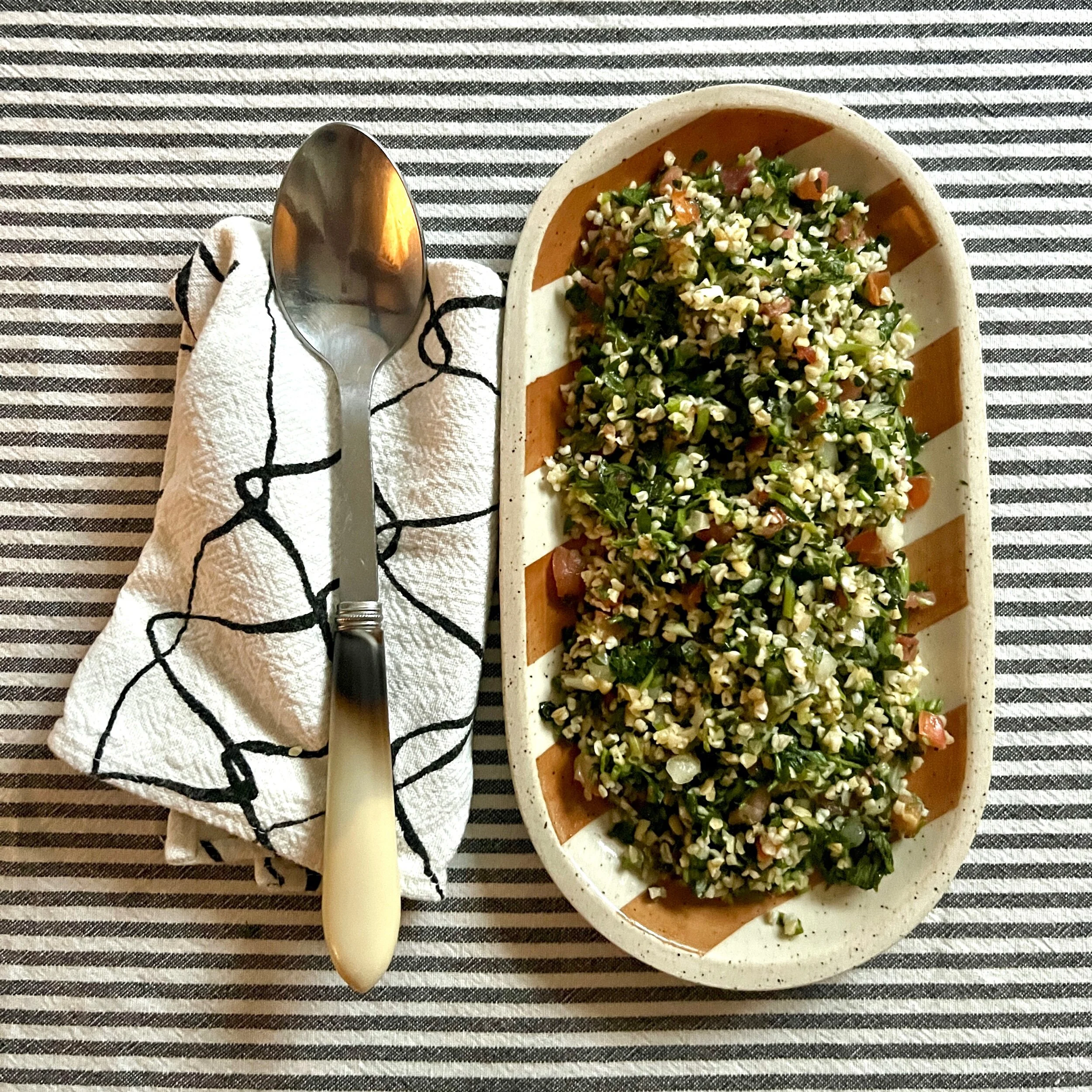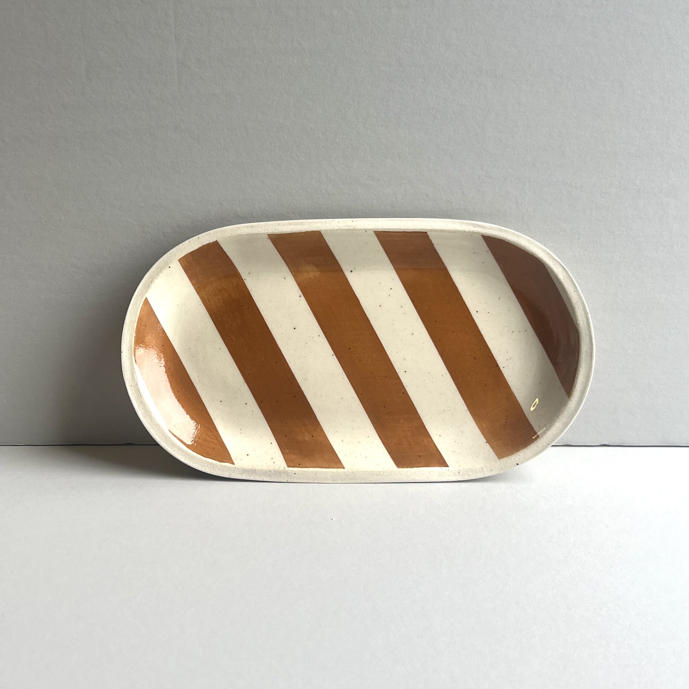 Bold stripes in a rich caramel color with a raw speckled-clay edge. A versatile shape for a cheese plate or a salad or to gather all the things on your counter and make them pretty.