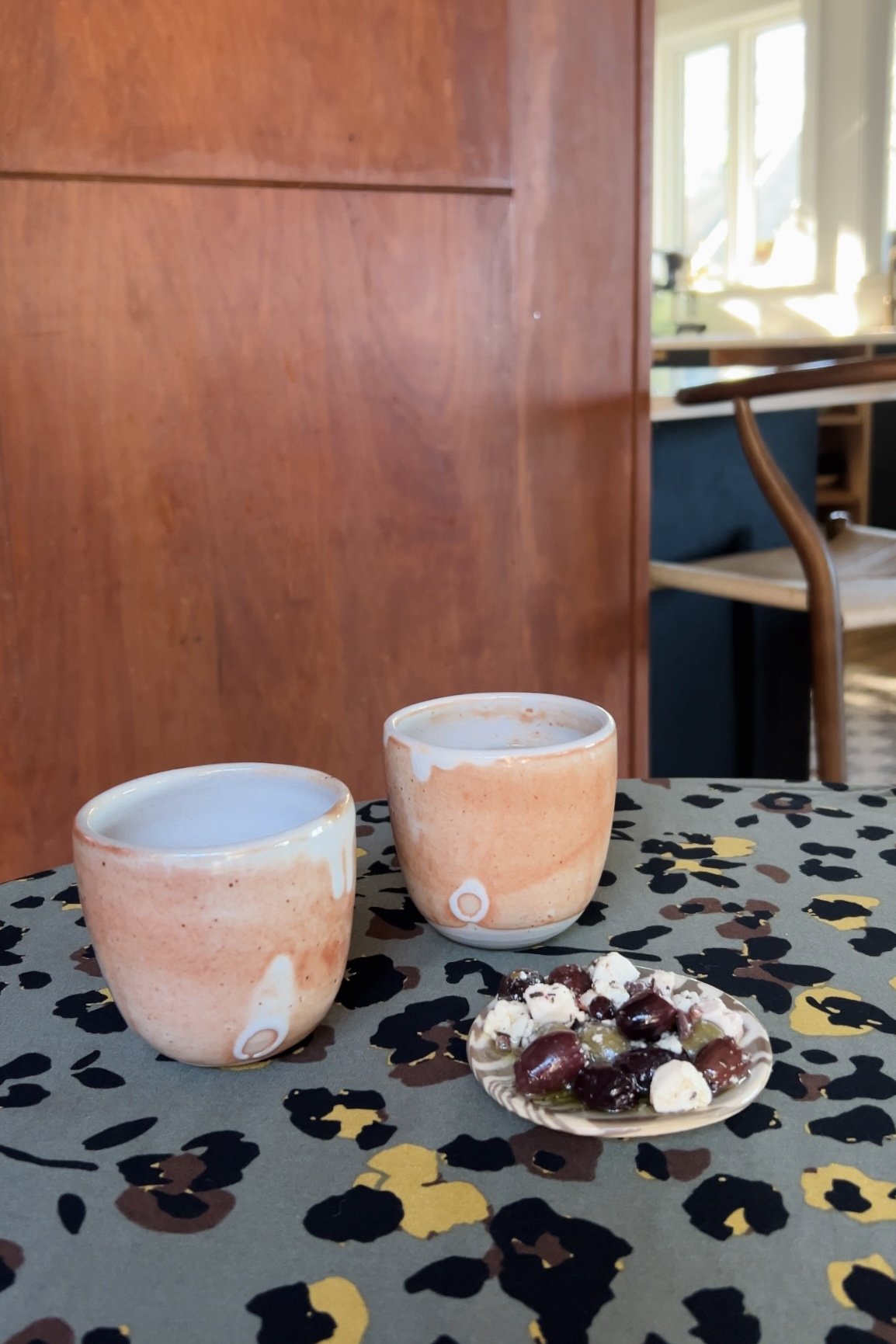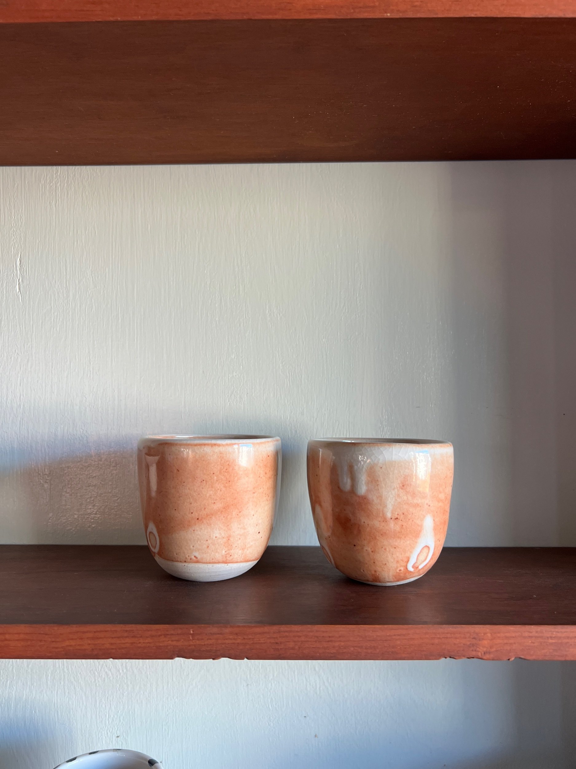 Pair of driking glasses in an inviting organic shape. After firing in a high-fire gas kiln, the pretty (and unpredictable) shino glaze results in colors from pearly white to peach to salmon.